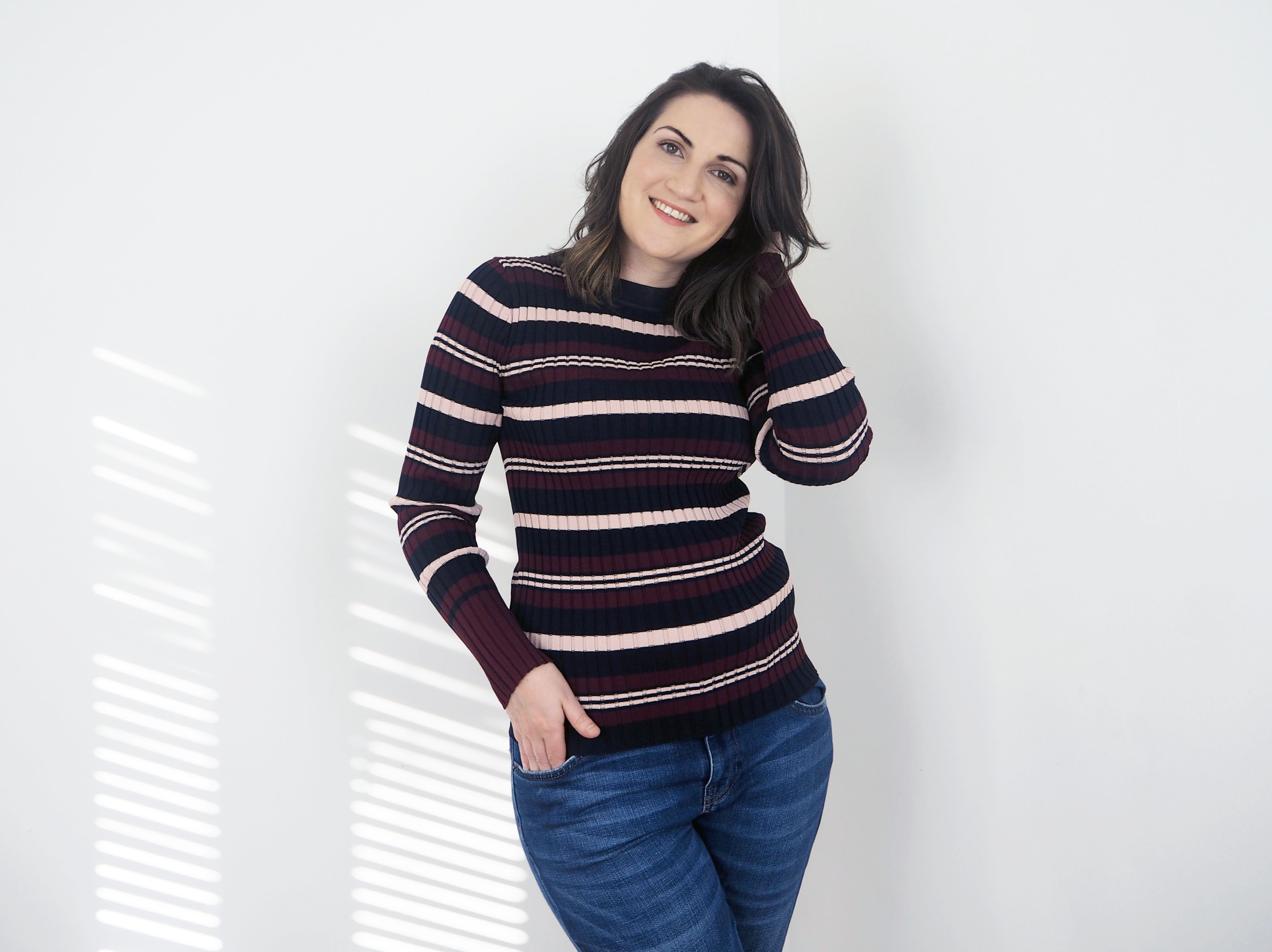 For me, the stand out piece of this outfit has to be the burgundy stripe top. Red is one of my favourite colours, especially the deeper maroons and burgundy shades. You can pretty much guarantee that if I’m wearing colour it’s going to be a shade of red. For my autumn colour scheme, I knew I wanted to add some deep shades of red along with some navy and peachy pinks. So after seeing this stripe jumper in Whistles I knew I had to add it to my wardrobe. This top manages to incorporate nearly every colour in my autumn colour scheme. I love the way the colours add something special to what is a basic stripe sweater. And these are some beautiful colours (the photos don’t do them justice) with the deep burgundy, navy and dusty/peachy pink, they just scream autumn. I love how sometimes you can find one piece which encapsulates the whole season and pulls together your wardrobe. I love the subtle nod to 70s styling with this top but it still manages to stay modern, although with the right styling could create a true 70s look. I see myself getting a lot of wear out of this top this autumn/winter. It’s lightweight enough to wear alone right now, and there is room to fit a thermal underneath as the weather gets colder.
